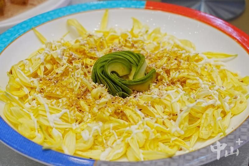 牛油果菊花刺身、菊花特色撈雞、菊花梗燉竹絲雞湯、菊花八寶鴨……晚上7時(shí)整,一朵朵新鮮的食用菊,經(jīng)過(guò)廚師們的巧手,化身為一道道令人垂涎的佳肴,牛油果菊花刺身以其獨(dú)特的美感和口感成為宴席上的亮點(diǎn)。