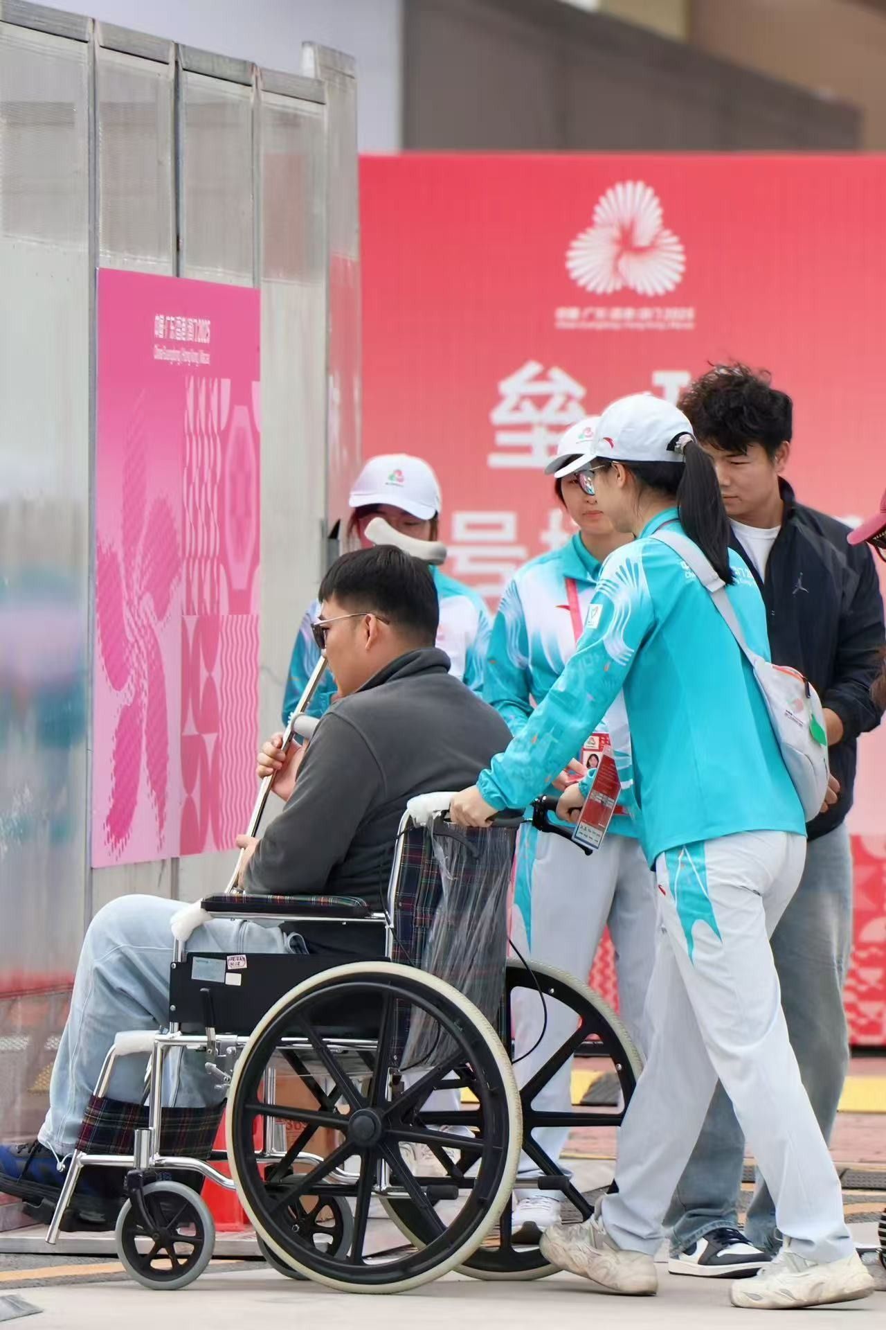 除了指引路線、維持秩序、幫拍合照、解答問詢等常規(guī)服務(wù),還要應(yīng)對(duì)各種突發(fā)事件。賽事第一天,志愿者就遇到了一位拄雙拐的觀眾,他從四川遠(yuǎn)道而來,雖然腿受傷了,也要見證支持的球隊(duì)贏球。志愿者們立刻啟動(dòng)了“無障礙運(yùn)送”機(jī)制,從東門借來公共輪椅讓這位球迷就座,一邊查驗(yàn)門票,確認(rèn)觀賽場次,并立刻報(bào)告相應(yīng)場館的負(fù)責(zé)人;隨后推著輪椅將送他平穩(wěn)到賽事場館樓下,再和館內(nèi)觀眾區(qū)志愿者通力合作,接送至無障礙觀賽區(qū)。這樣流程,每天都在發(fā)生,“小海豚”們默契配合、服務(wù)周到,讓每一位觀眾都能帶著暖意、安全舒適地觀賽。
