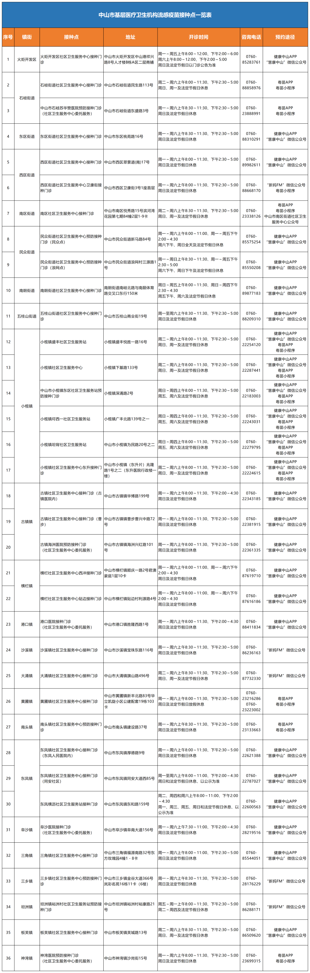 為方便群眾就近接種,中山市衛(wèi)生健康局12月9日公布中山市基層醫(yī)療衛(wèi)生機(jī)構(gòu)流感疫苗接種點(diǎn)完整名單,涵蓋機(jī)構(gòu)地址、開放時(shí)間、預(yù)約方式及咨詢電話。