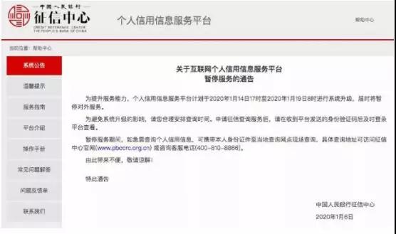 1月6日,央行征信中心公告稱,為提升服務能力,個人信用信息服務平臺計劃于2020年1月14日17時至2020年1月19日8時進行系統(tǒng)升級,屆時將暫停對外服務。期間如急需查詢個人信用信息,可攜帶本人身份證件至當?shù)夭樵兙W(wǎng)點現(xiàn)場查詢。