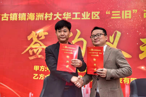 1月10日,在村民代表見證下,古鎮(zhèn)鎮(zhèn)海洲村大華工業(yè)區(qū)“三舊改造”合作開發(fā)項目在該村村委會簽約。