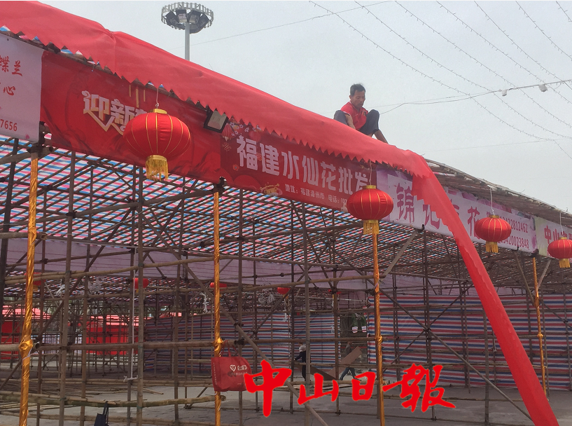 和往年不同,今年迎春花市設置在靠近起灣道的沙崗墟文化廣場舉行,花市面積擴大至12000平方米。記者現(xiàn)場看到,花市棚架已經(jīng)基本搭好,大多數(shù)商戶的招牌也已經(jīng)掛好,已經(jīng)有部分商戶開始迫不及待地進場布置?!?5號就開市了,抓緊布置一下,”一名商戶說。