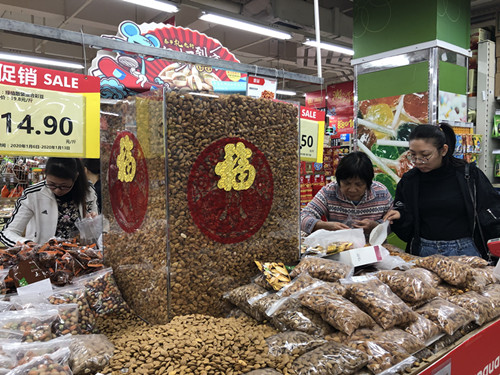 超市入口,紅紅的中國結(jié)和燈籠把走道裝扮一新,濃濃的年味撲面而來。一些市民正在選購春聯(lián)、鼠年吉祥物等商品。在蔬菜副食區(qū),新鮮的蒜黃、芹菜、西紅柿等擺放在選購臺上,紅黃綠的搭配給市民視覺上的享受。在干果區(qū),開心果、松子、瓜子、巴旦木等產(chǎn)品應有盡有,吸引眾多市民前來挑選。