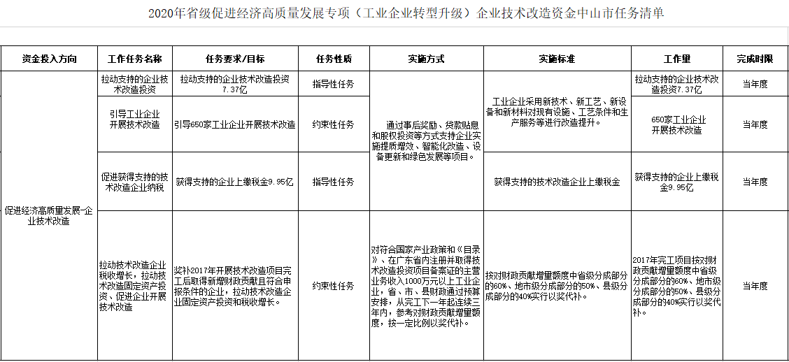 按要求,中山市當(dāng)年度要拉動(dòng)支持的企業(yè)技改投資7.37億元,引導(dǎo)650家工業(yè)企業(yè)開展技術(shù)改造。通過事后獎(jiǎng)勵(lì)、貸款貼息和股權(quán)投資等方式支持企業(yè)實(shí)施提質(zhì)增效、智能化改造、設(shè)備更新和綠色發(fā)展等項(xiàng)目。同時(shí),獎(jiǎng)補(bǔ)2017年開展技術(shù)改造項(xiàng)目完工后取得新增財(cái)政貢獻(xiàn)且符合申報(bào)條件的企業(yè),拉動(dòng)技術(shù)改造企業(yè)固定資產(chǎn)投資和稅收增長。
