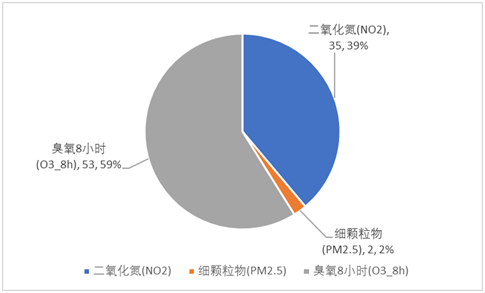 污染物方面,第四季度全市主要空氣污染物為臭氧八小時(shí),其作為每日首要污染物的比例為58.9%,其次分別是二氧化氮(NO2)、PM2.5,分別占38.9%、2.2%。