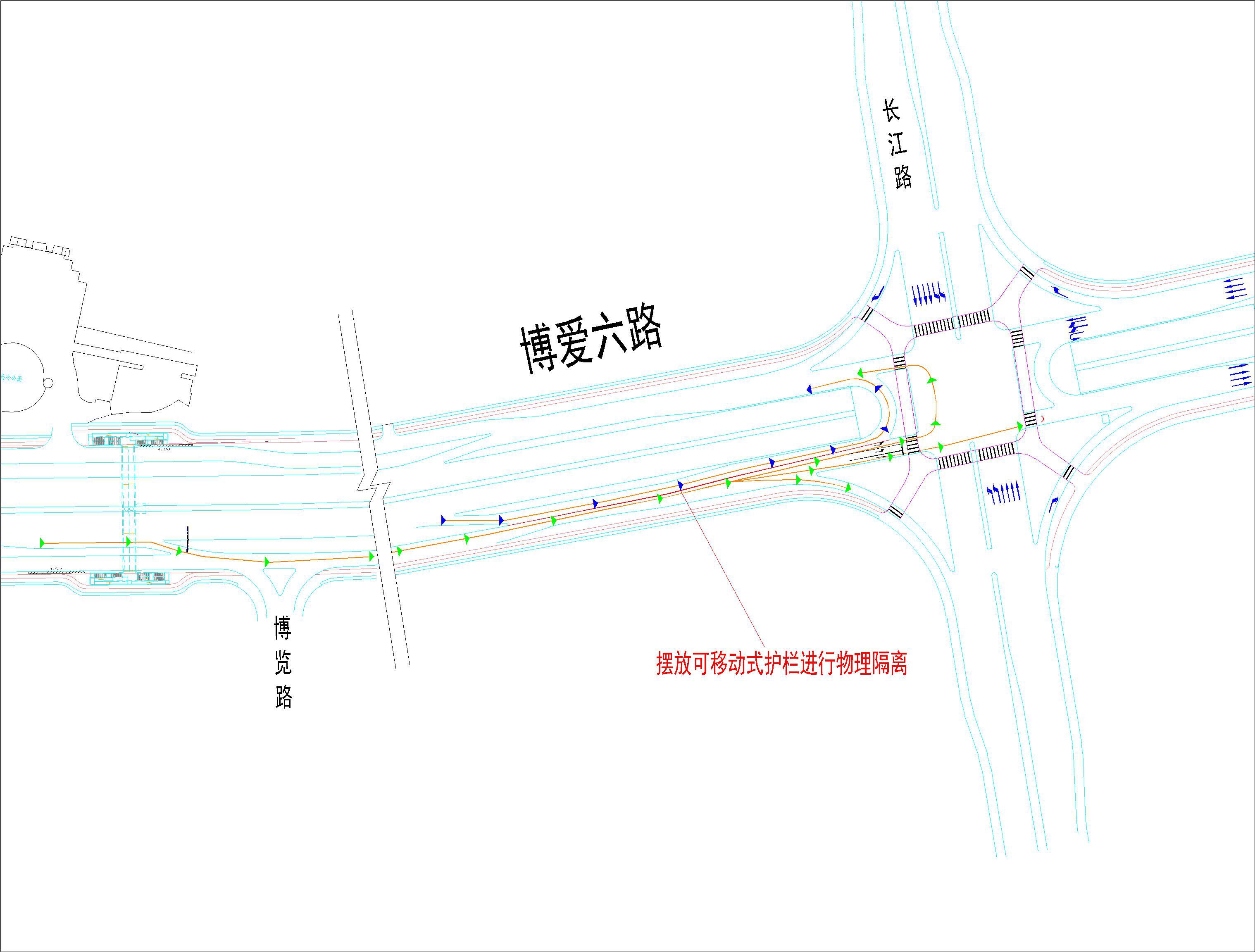 ◆由博愛六路東行前往長江路南行方向的車輛須在博愛六路中山市行政服務中心匝道口對開提前進入輔道通行。