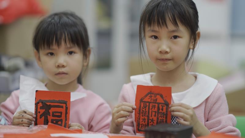 1月16日,沙溪鎮(zhèn)圣獅村文化室內(nèi),桌子上擺滿了一沓沓裁剪好的小紅紙,3名小學(xué)生正用自制的木印板印制春節(jié)的“開門大吉”。淡淡的墨跡滲透紅紙印在了小手上,孩子的祝福滲透紅紙印入了每份“開門大吉”之中。