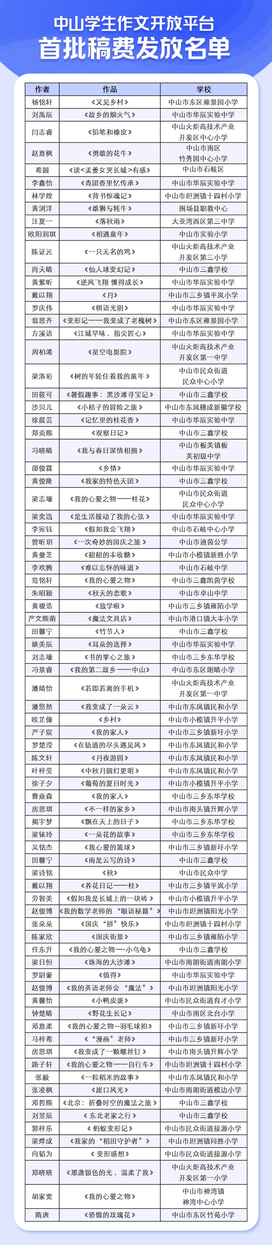經(jīng)過一段時間試運(yùn)行后,“中山學(xué)生作文開放平臺”首批被“中山+”教育頻道采用稿件名單出爐! 恭喜這些小作者,獲得“稿費+證書”雙重獎勵。后續(xù)將有工作人員聯(lián)系獲獎?wù)甙l(fā)放稿費。