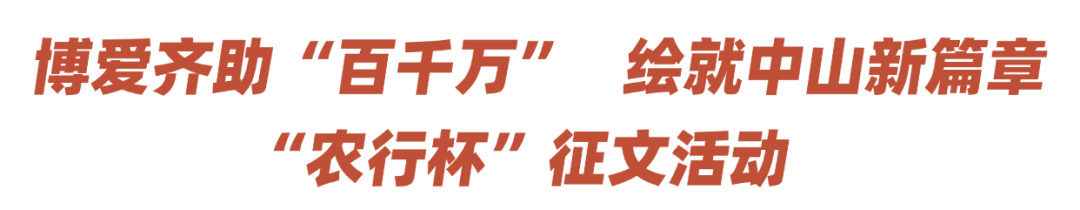 請將命名為“姓名+手機(jī)號(hào)”的作品文檔發(fā)送至zsnews2025@163.com,郵件標(biāo)題格式:博愛齊助“百千萬”,繪就中山新篇章“農(nóng)行杯”征文活動(dòng)——某某某。