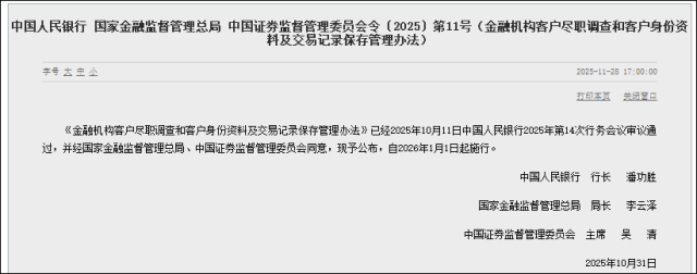 11月28日,中國人民銀行、國家金融監(jiān)督管理總局、中國證監(jiān)會聯(lián)合發(fā)布《金融機構(gòu)客戶盡職調(diào)查和客戶身份資料及交易記錄保存管理辦法》。其中,“個人存取現(xiàn)金超5萬元需登記資金來源”的規(guī)定取消,與此前的征求意見稿保持了一致。