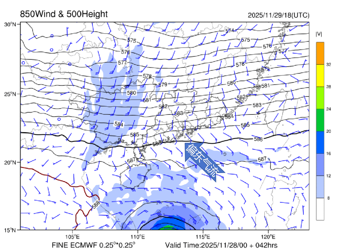 11月30日2時(shí)850風(fēng)場(chǎng)數(shù)值預(yù)報(bào)圖。