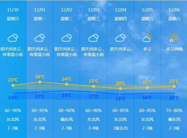 11月30日,廣東省中南部市縣陰天間多云,有小雨,其余市縣多云到陰天,局部有小雨。最低氣溫:粵北、云浮、珠三角北部和粵東市縣6~12℃,珠江口附近和粵西沿海市縣17~19℃。