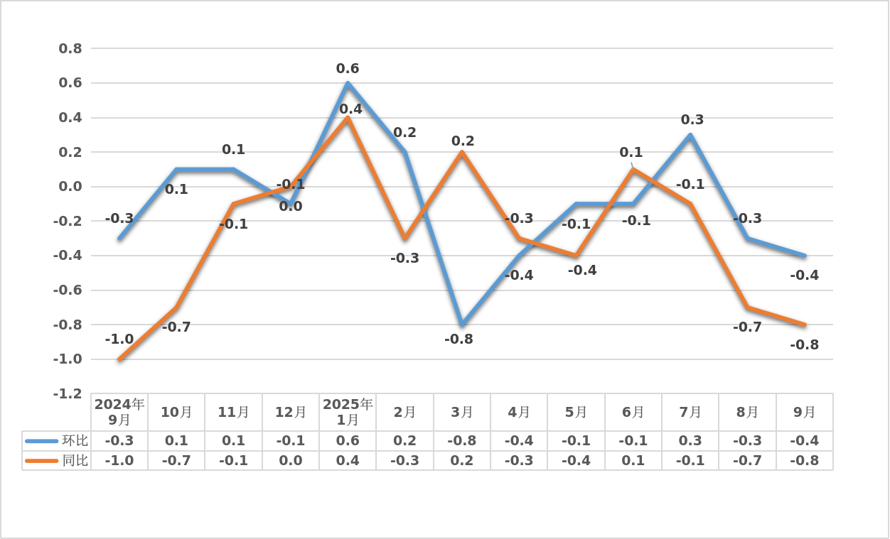 月度環(huán)比、同比價格小幅波動,第三季度同比降幅擴大。從月度環(huán)比看,1—3月,受春節(jié)需求變化等因素影響,CPI沖高后回落;4—6月,隨著氣溫升高,鮮菜供給增加、豬肉消費需求轉(zhuǎn)弱,推動CPI繼續(xù)回落;7—9月,隨著暑假旅游旺淡季轉(zhuǎn)換,CPI先漲后跌。從月度同比看,1—9月份CPI“三漲六降”,小幅上下波動。