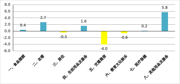 八大類商品及服務(wù)價格累計同比“五升三降”。分類別看,前三季度八大類商品和服務(wù)價格指數(shù)累計同比“五升三降”。其中,其他用品及服務(wù)類價格上漲5.8%,衣著類價格上漲2.7%,生活用品及服務(wù)類價格上漲1.6%,食品煙酒類價格上漲0.4%,醫(yī)療保健類價格上漲0.2%;交通通信類價格下降4.0%,教育文化娛樂類價格下降0.6%,居住類價格下降0.5%。