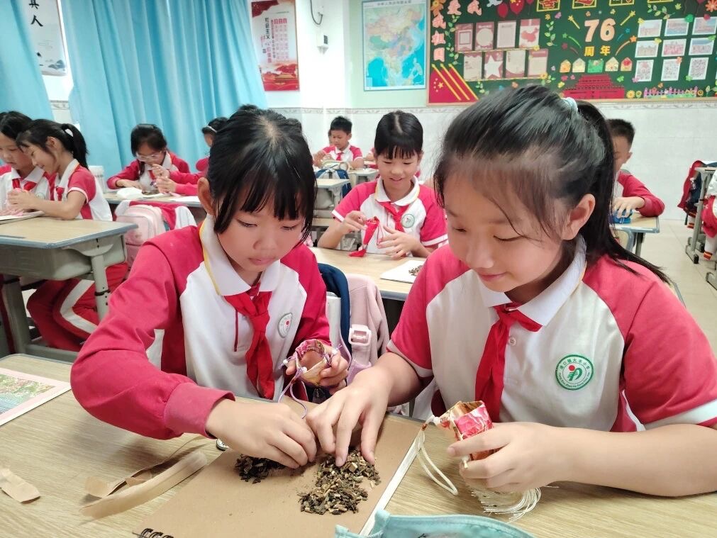 主題班會(huì)期間,不少班級(jí)還增設(shè)了傳統(tǒng)香囊制作實(shí)踐環(huán)節(jié),讓同學(xué)們?cè)趧?dòng)手實(shí)踐中傳承習(xí)俗、寄托孝心。在老師的悉心指導(dǎo)下,同學(xué)們選取香附、木香、佩蘭、艾草等天然草藥作為原料,這些草藥兼具醒神驅(qū)蚊、解郁安神的實(shí)用功效。