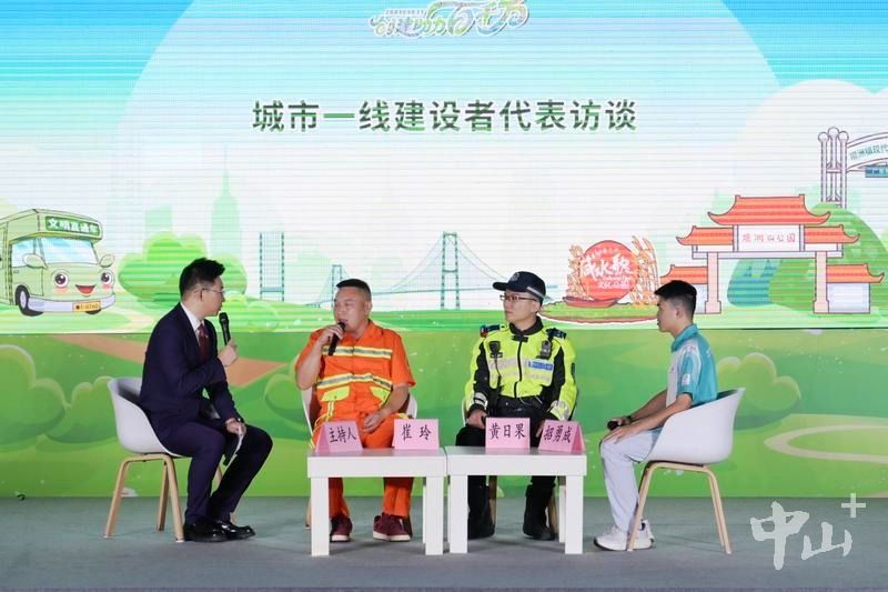 重頭戲“城市文明大家談”環(huán)節(jié)隨即到來?;顒友堉猩酵犊丨h(huán)境科技有限公司機械保潔班班長崔玲、交警城區(qū)大隊石岐街道二中隊輔警班長黃日果、第十五屆全運會“小海豚”志愿者招勇成三位來自不同領域的城市建設者做客現(xiàn)場,分享自己的“城市建設故事”。
