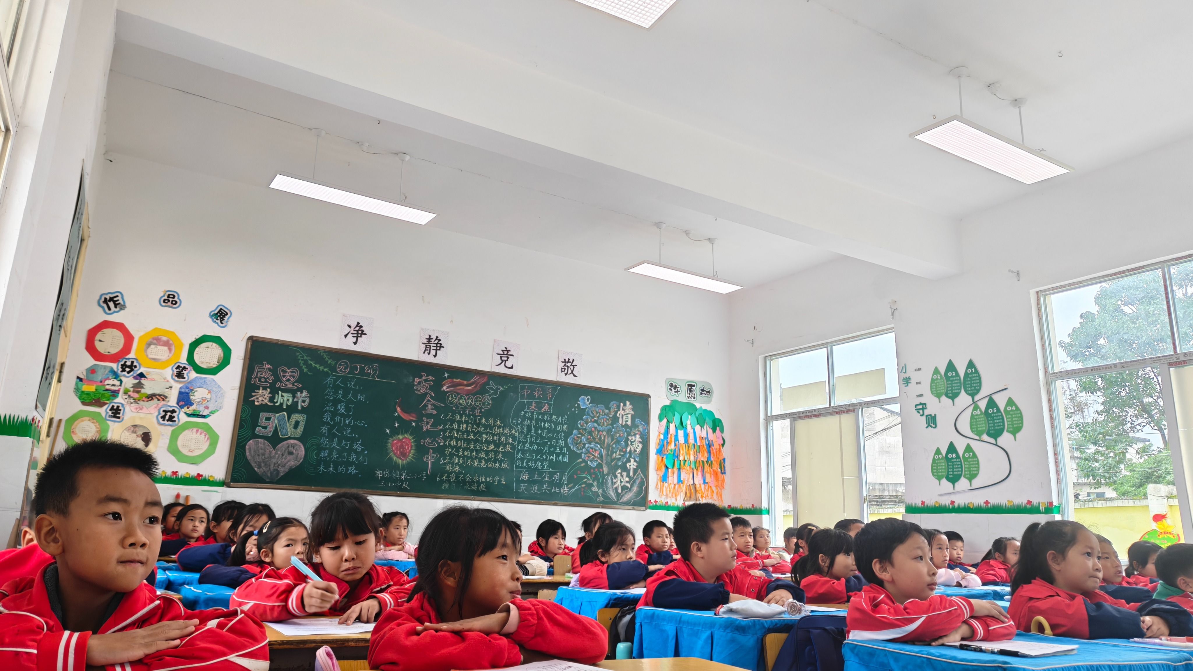 11月5日下午4點,六盤水市六枝特區(qū)郎岱鎮(zhèn)第二小學的室外霧氣彌漫,室內(nèi)卻光潔如晝。四年級教室的天花板上,六盞護眼燈發(fā)出均勻柔和的光線,孩子們正在燈下埋頭書寫。
