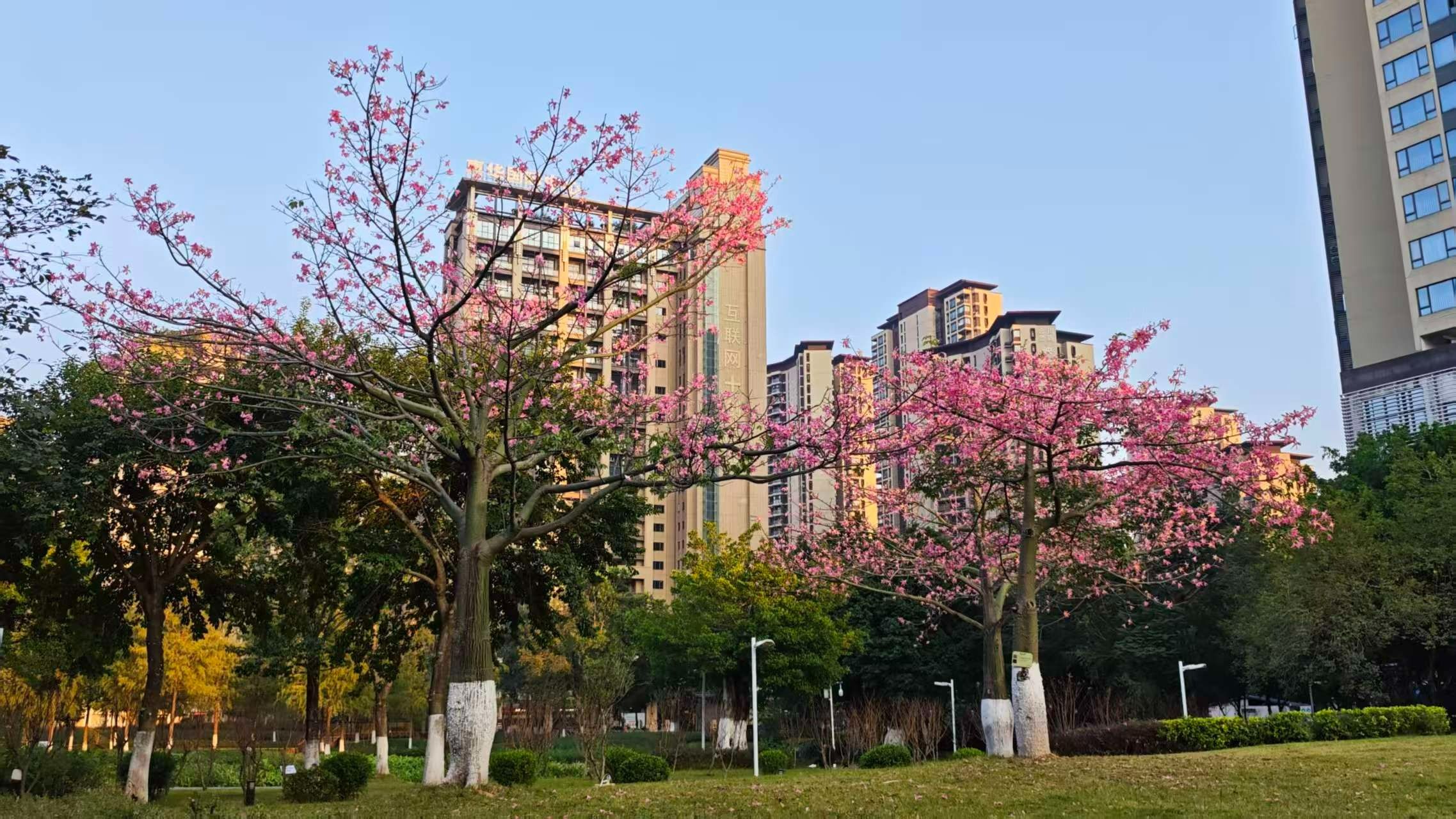 與此同時,彩虹綠洲公園的美麗異木棉也已進入盛花期。數(shù)株“美人樹”枝頭綴滿粉色花朵,在冬日陽光下顯得格外動人。這種喬木花期長達數(shù)月,從9月持續(xù)至翌年1月,成為冬日里一道亮麗的風景線。