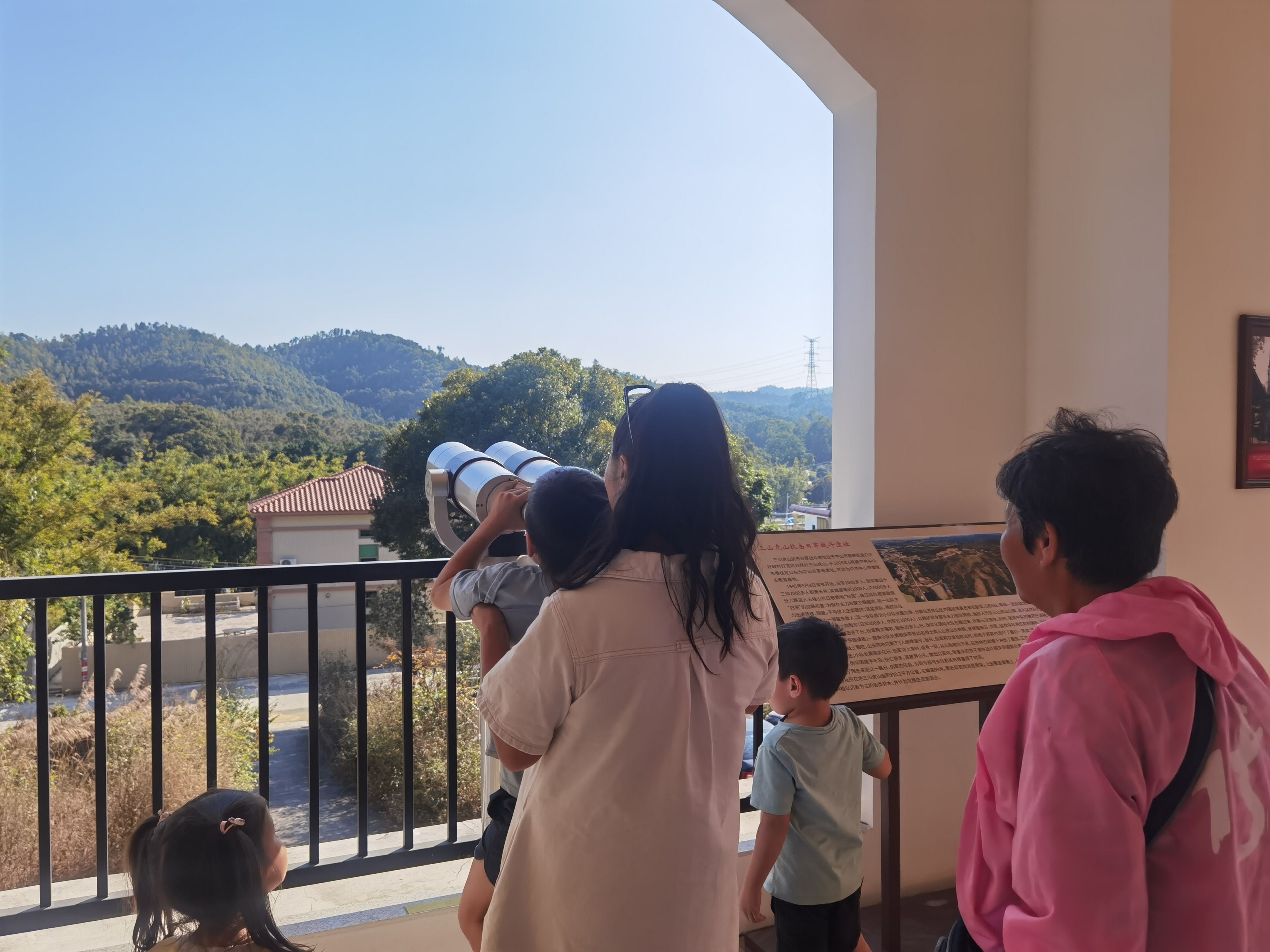 不同于此前的游山玩水,1月14日這天下午,甘建清牽著孩子們的手,走進 “中山抗戰(zhàn)烽火愛國主義教育展覽”。通過展覽中的影像資料,她的三個外孫終于見到了她的父親甘子源。年幼的孩子,或許還無法理解這場“見面”的意義,但他們專注的神情告訴我們,甘子源的故事,已深深地印刻在他們的腦海中。他們也學著外婆和母親的模樣,通過望遠鏡看向遠方的三山虎山。