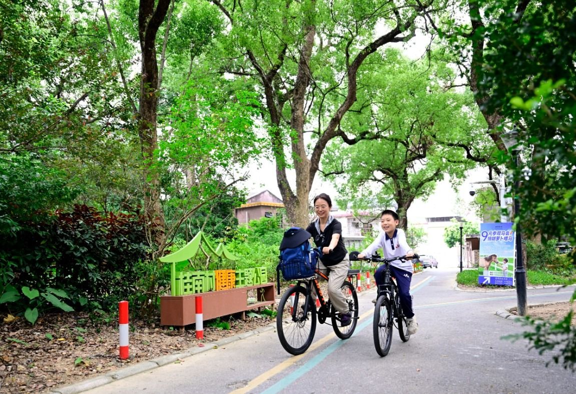或步行或騎車,家長(zhǎng)陪伴孩子放學(xué)。記者 余兆宇 攝