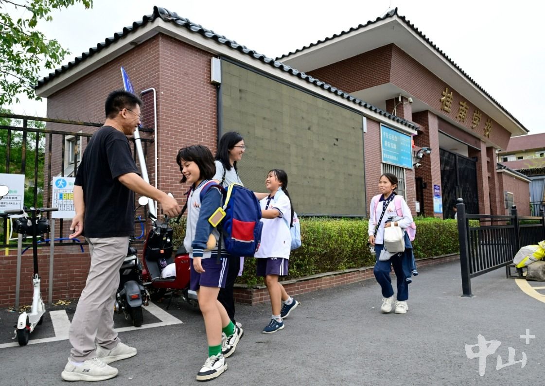 家長(zhǎng)在桂南學(xué)校門(mén)口接孩子放學(xué)。記者 余兆宇 攝
