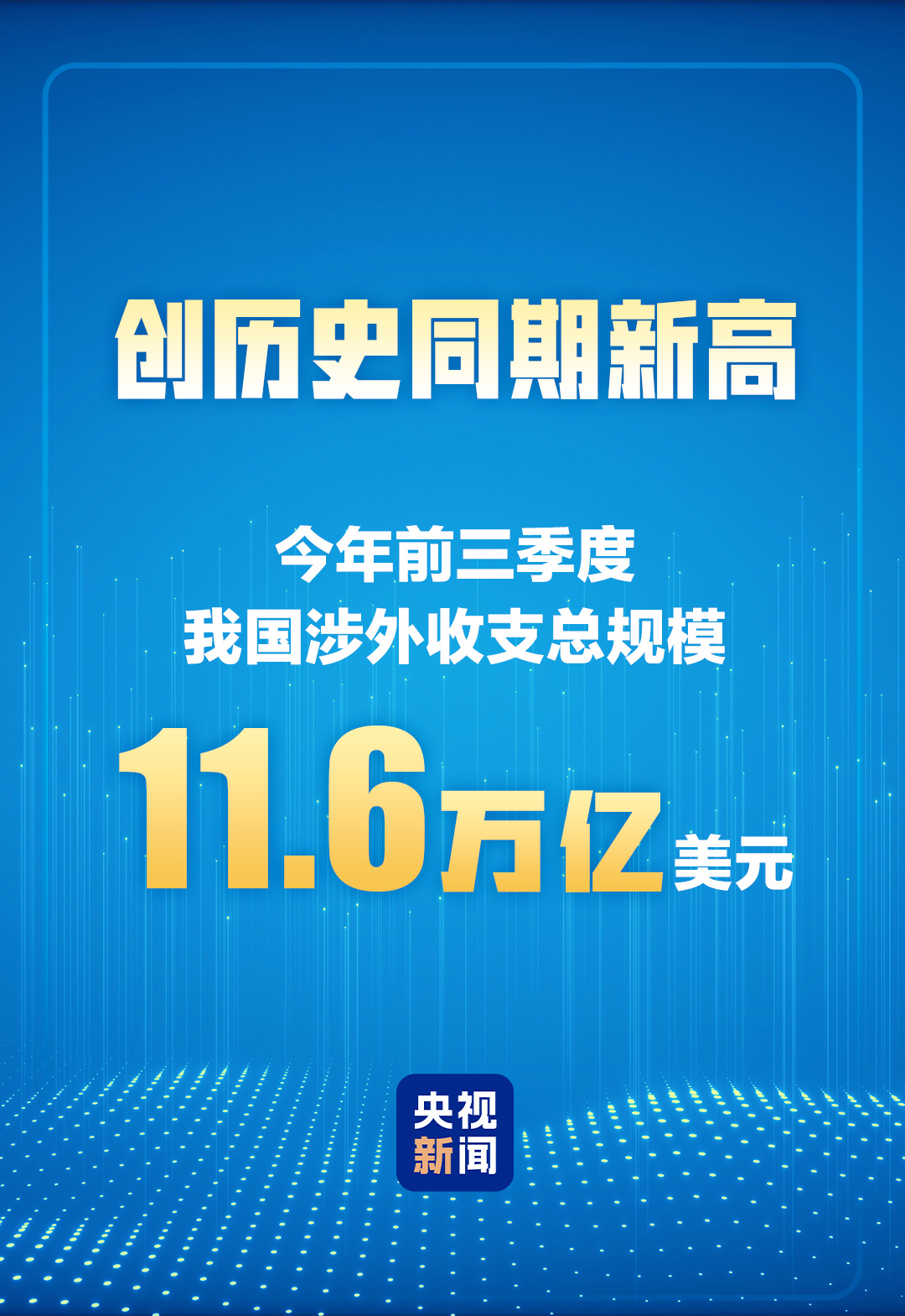 國家外匯管理局10月22日發(fā)布數(shù)據(jù)顯示,今年前三季度,我國涉外收支總規(guī)模11.6萬億美元,創(chuàng)歷史同期新高,同比增長10.5%,跨境資金凈流入1197億美元,銀行結(jié)售匯順差632億美元,均高于上年同期水平。