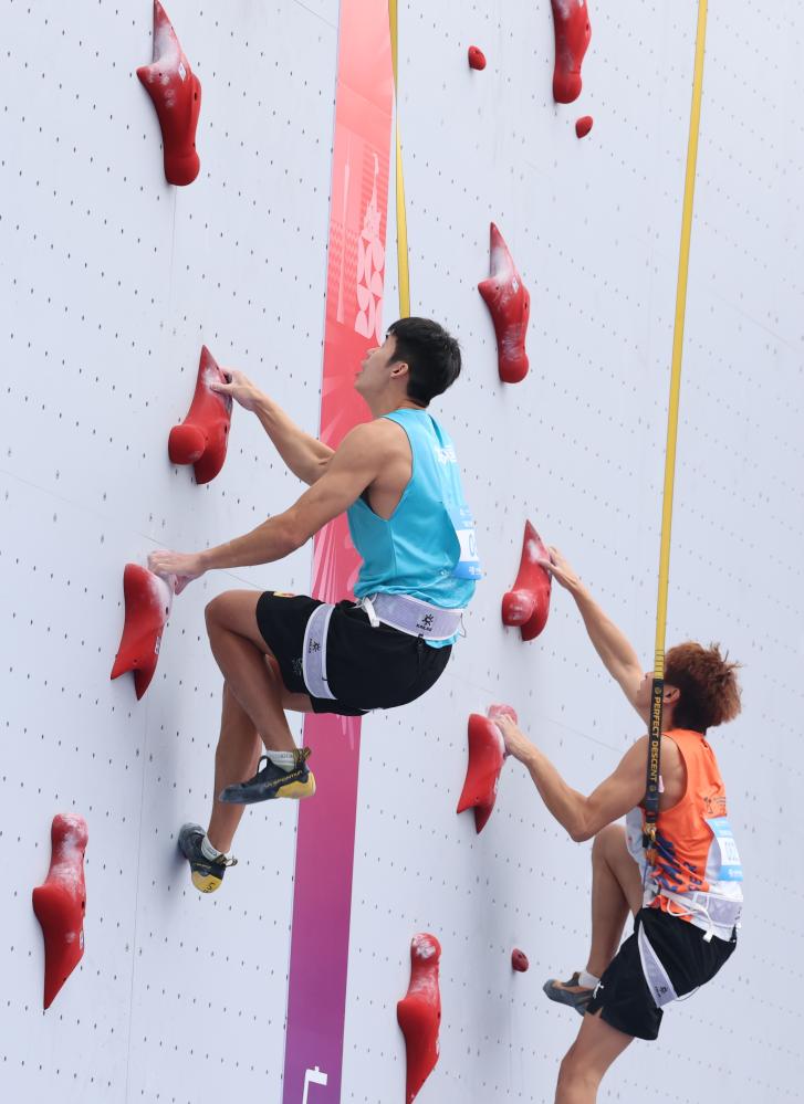11月13日,貴州隊(duì)選手龍見國(guó)(左)在比賽中。最終,他晉級(jí)下一輪。當(dāng)日,第十五屆全國(guó)運(yùn)動(dòng)會(huì)攀巖項(xiàng)目男子速度預(yù)賽在廣州舉行。新華社記者 楊世堯 攝