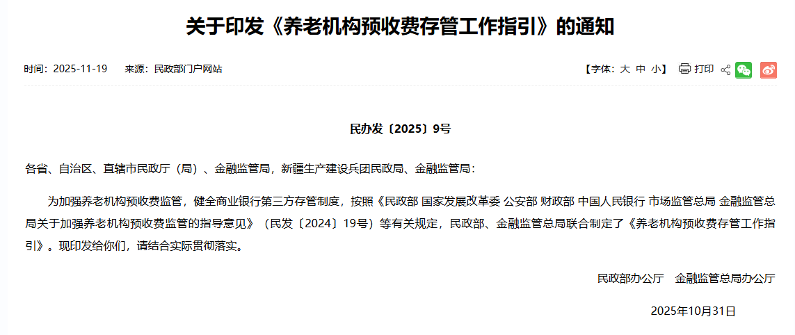 記者11月19日從民政部網(wǎng)站獲悉,為加強(qiáng)養(yǎng)老機(jī)構(gòu)預(yù)收費(fèi)監(jiān)管,健全商業(yè)銀行第三方存管制度,民政部、金融監(jiān)管總局近日聯(lián)合印發(fā)《養(yǎng)老機(jī)構(gòu)預(yù)收費(fèi)存管工作指引》,就養(yǎng)老機(jī)構(gòu)專用存款賬戶的開立、變更和撤銷,存管資金的使用與退還、資金異常流動情形等作出要求。