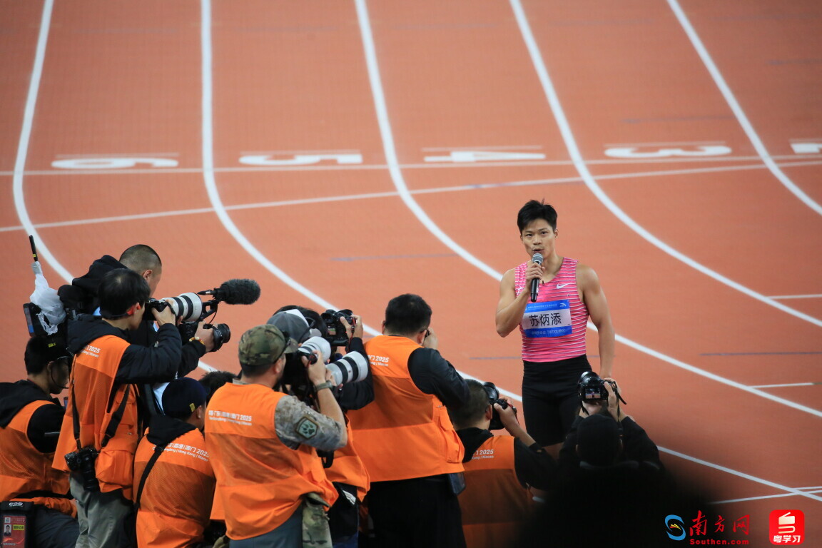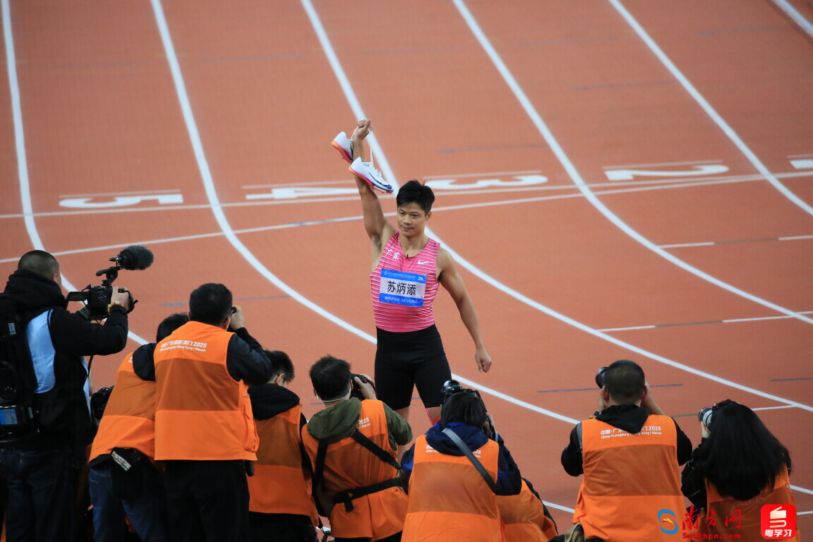 十五運(yùn)會(huì)田徑男子4×100米接力決賽結(jié)束后,蘇炳添在現(xiàn)場(chǎng)與大家告別。攝影 南方網(wǎng)、粵學(xué)習(xí)記者 劉競(jìng)宇