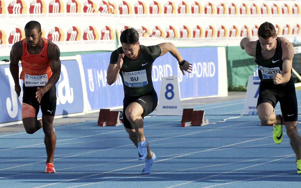 2018年6月22日,國(guó)際田聯(lián)世界田徑挑戰(zhàn)賽馬德里站,中國(guó)選手蘇炳添以9秒91的成績(jī)獲得男子100米冠軍。(圖 新華社)