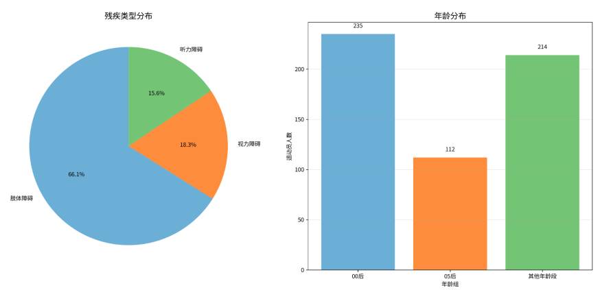 代表團(tuán)運(yùn)動(dòng)員平均年齡32.23歲,包括17名殘奧會(huì)冠軍、335名肢體障礙運(yùn)動(dòng)員(含188名輪椅運(yùn)動(dòng)員)、93名視力障礙運(yùn)動(dòng)員、79名聽力障礙運(yùn)動(dòng)員。其中有394名運(yùn)動(dòng)員為首次參加全國(guó)殘運(yùn)會(huì),占比為70.23%,有167名運(yùn)動(dòng)員參加過(guò)兩屆及以上全國(guó)殘運(yùn)會(huì),有13名運(yùn)動(dòng)員代表廣東征戰(zhàn)過(guò)六屆全國(guó)殘運(yùn)會(huì)。廣東省代表團(tuán)運(yùn)動(dòng)員中年齡最大的是乒乓球項(xiàng)目63歲老將黃麗明,年齡最小的是輪椅擊劍項(xiàng)目小將鐘英杰,他將在正賽期間迎來(lái)14歲生日。參賽運(yùn)動(dòng)員中“00后”運(yùn)動(dòng)員235人,“05后”運(yùn)動(dòng)員112人,分別占運(yùn)動(dòng)員總數(shù)的41.9%、20%。