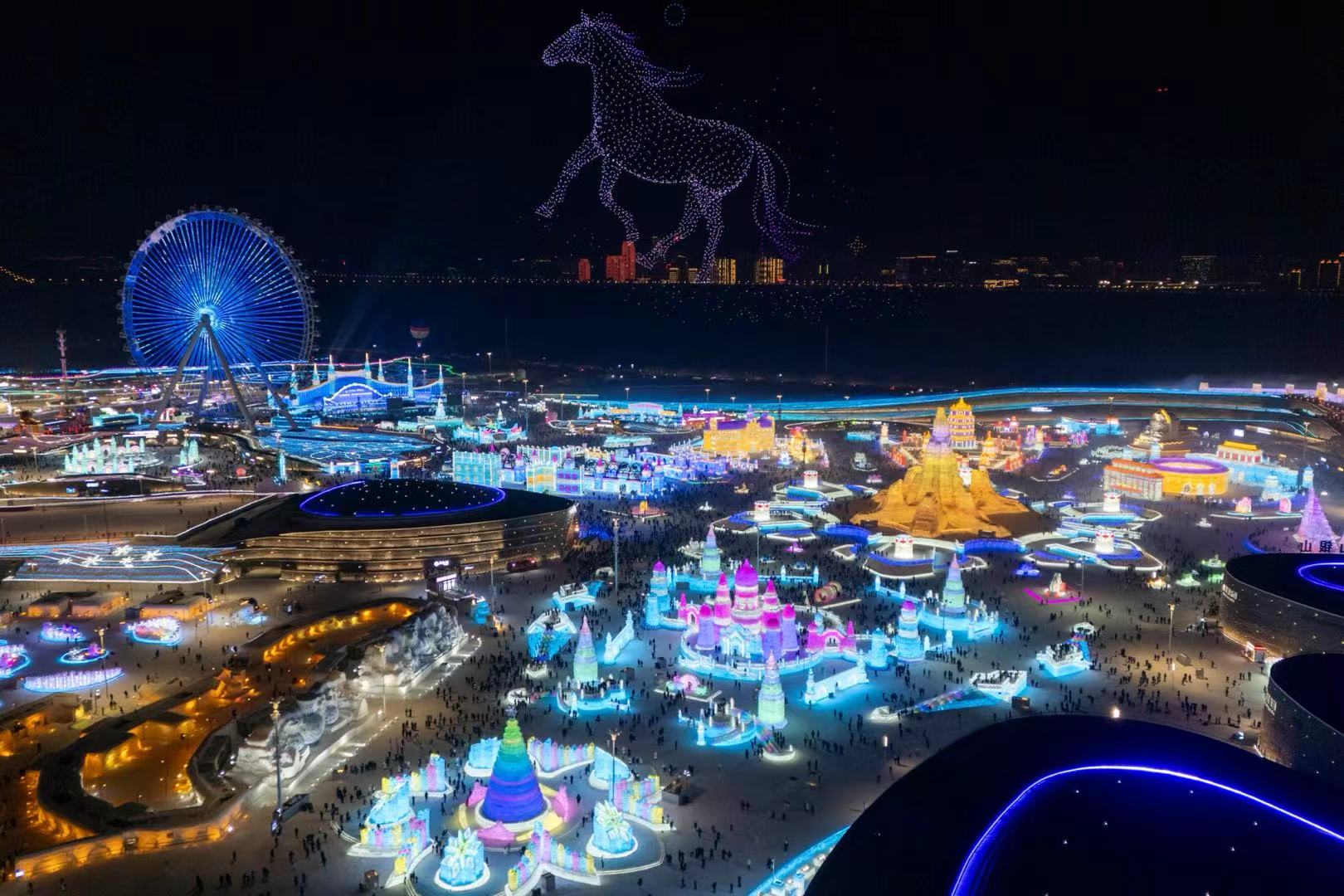 2026年1月5日,哈爾濱冰雪大世界園區(qū)的無(wú)人機(jī)表演。新華社記者 張濤 攝