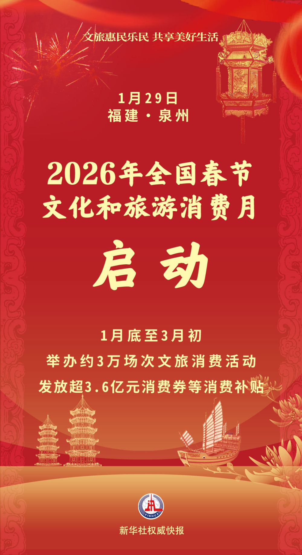 1月29日,文化和旅游部在福建省泉州市正式啟動2026年全國春節(jié)文化和旅游消費月,組織各地圍繞春節(jié)假期開展文旅消費惠民活動,更好滿足人民群眾“歡歡喜喜過大年”美好生活需要。