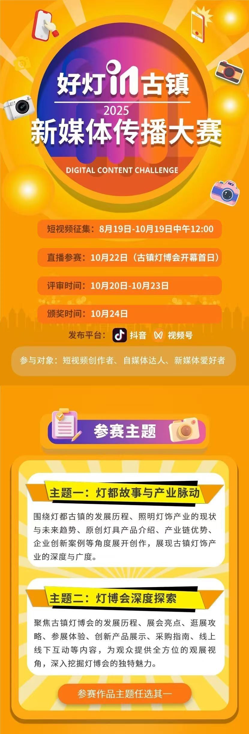 大賽對(duì)參賽作品主題有明確導(dǎo)向,一是聚焦古鎮(zhèn)燈飾產(chǎn)業(yè)核心,需展現(xiàn)燈都故事、發(fā)展歷程、產(chǎn)業(yè)現(xiàn)狀、未來(lái)趨勢(shì)及創(chuàng)新案例,挖掘產(chǎn)業(yè)深度與廣度;二是圍繞古鎮(zhèn)燈博會(huì)特色,通過(guò)直播形式提供全方位觀展視角,呈現(xiàn)展會(huì)亮點(diǎn)、逛展攻略、參展體驗(yàn)及采購(gòu)指南,助力展會(huì)氛圍營(yíng)造。