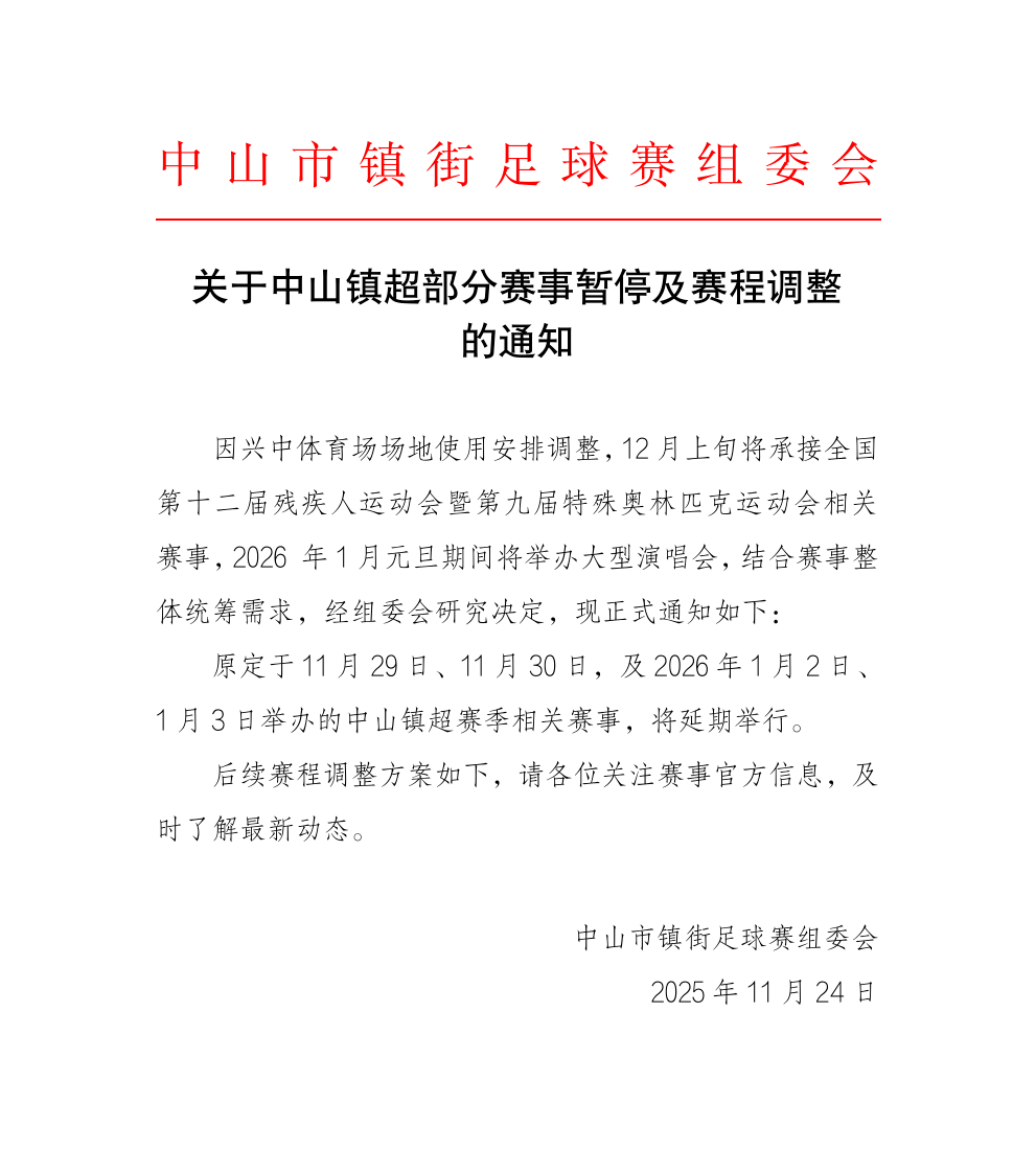 11月24日,中山市鎮(zhèn)街足球賽組委會(huì)發(fā)布公告,因興中體育場(chǎng)場(chǎng)地使用安排調(diào)整,原定于11月29日、11月30日,及2026年1月2日、1月3日舉辦的中山鎮(zhèn)超賽季相關(guān)賽事將延期舉行,詳情如下:
