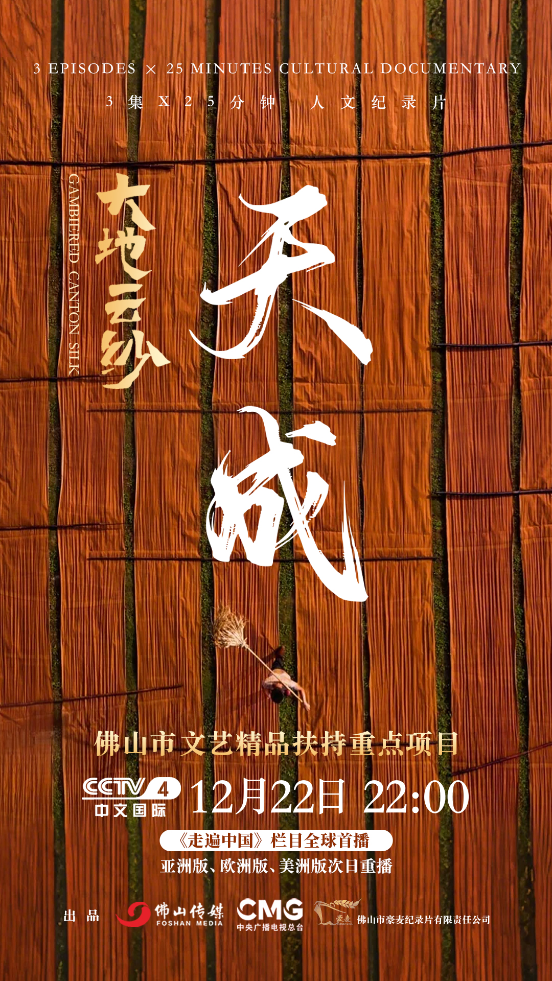 天地生絲,歲月成紗。香云紗,這一孕育于嶺南佛山的文化瑰寶,被譽為絲綢界的“軟黃金”,是流動的中國文化符號,更承載著大灣區(qū)與世界美美與共的愿景。以香云紗為核心題材,由佛山市委宣傳部統(tǒng)籌指導、佛山傳媒文旅集團·視頻中心承制的大型人文紀錄片《大地云紗》,于12月22日晚正式登陸央視中文國際頻道(CCTV-4)《走遍中國》黃金時段欄目,開啟全球首播。