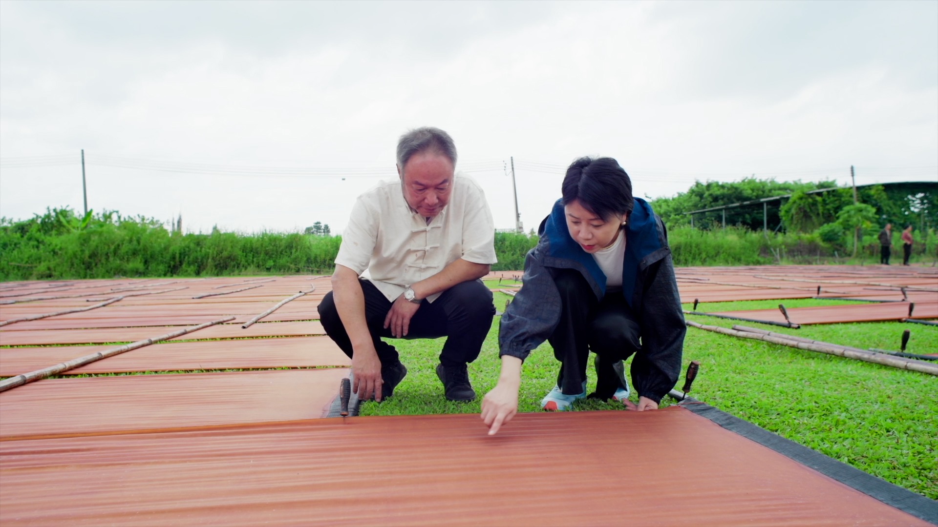 佛山香云紗老匠人周曉剛(左)與設計師邢莉莉(右)在曬莨場觀察香云紗制作情況。