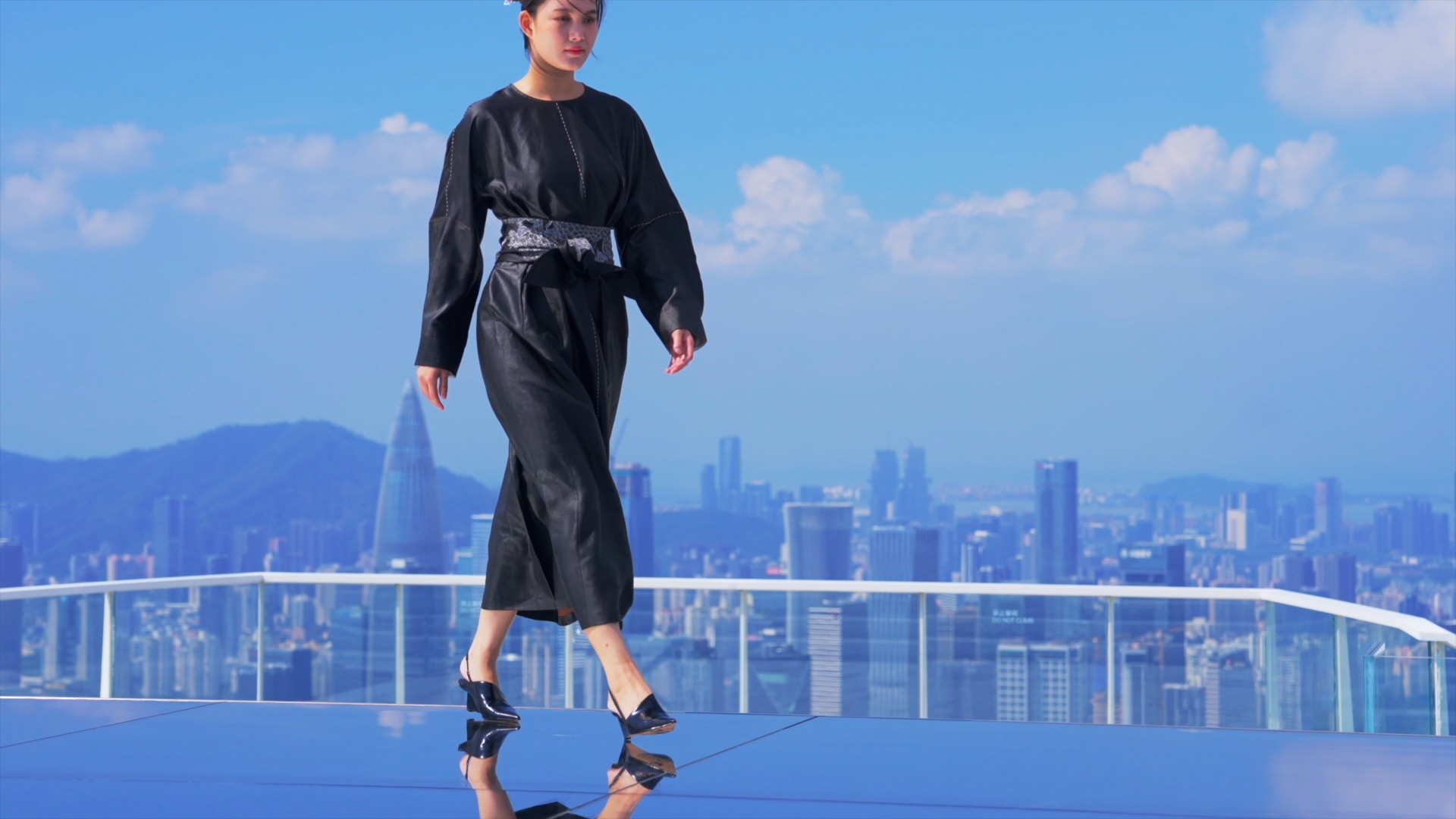 模特身著香云紗在深圳灣80層“天空之鏡”上走秀。以香云紗為原料制成的服飾融合傳統(tǒng)與現(xiàn)代,為國際展覽注入東方圖騰。