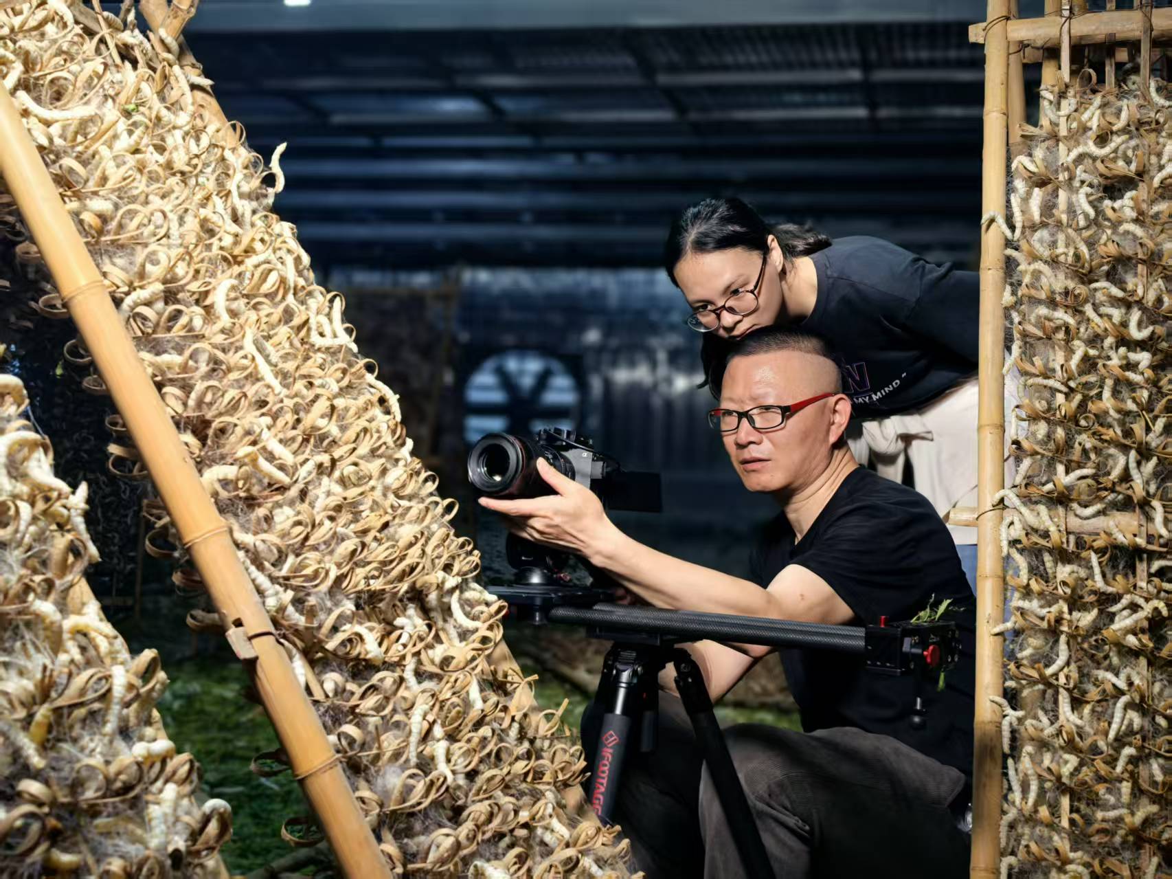 蠶房內(nèi),攝制組耐心等待捕捉幼蠶進食吐絲結繭全過程。