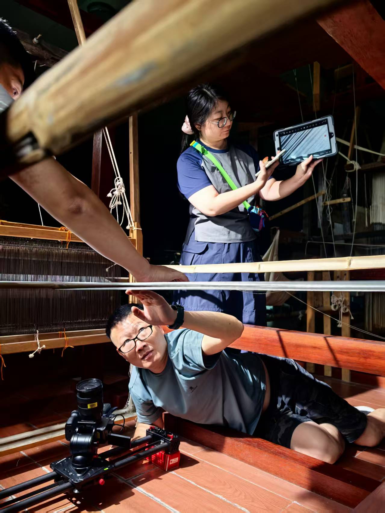 針線之間,光影重現(xiàn)。攝制組多角度取景呈現(xiàn)復原織機結構和香云紗織造工藝。