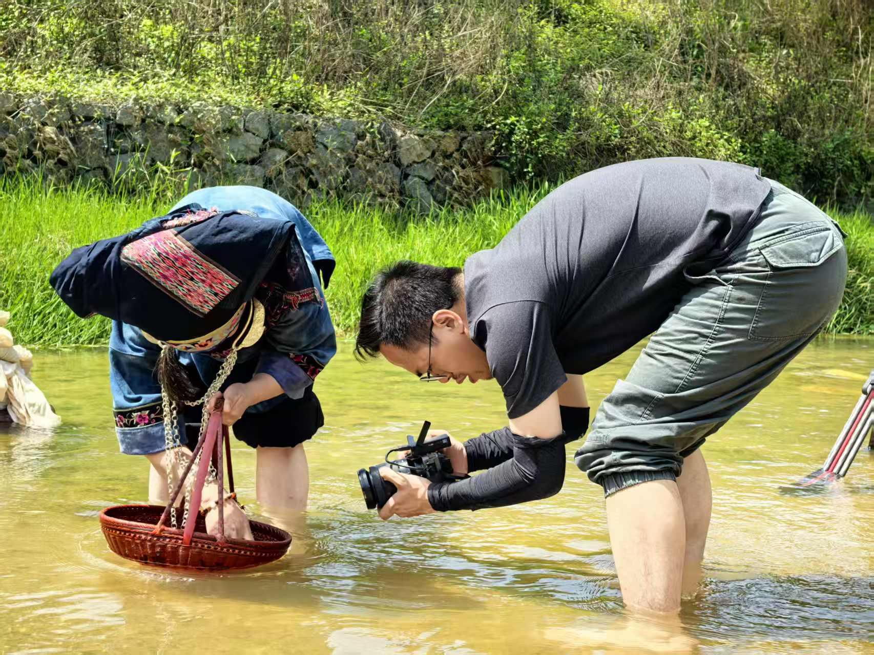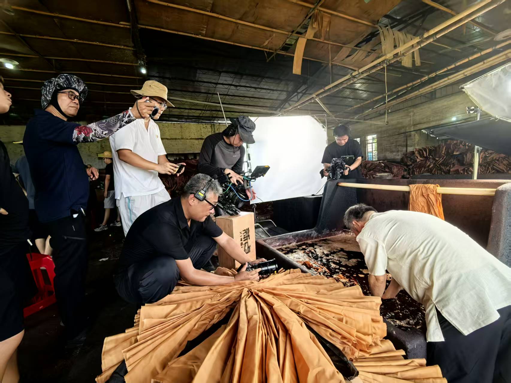 香云紗作坊內(nèi),攝制組連續(xù)多天跟蹤拍攝浸染薯莨液、晾曬等多個制作環(huán)節(jié)和場景。