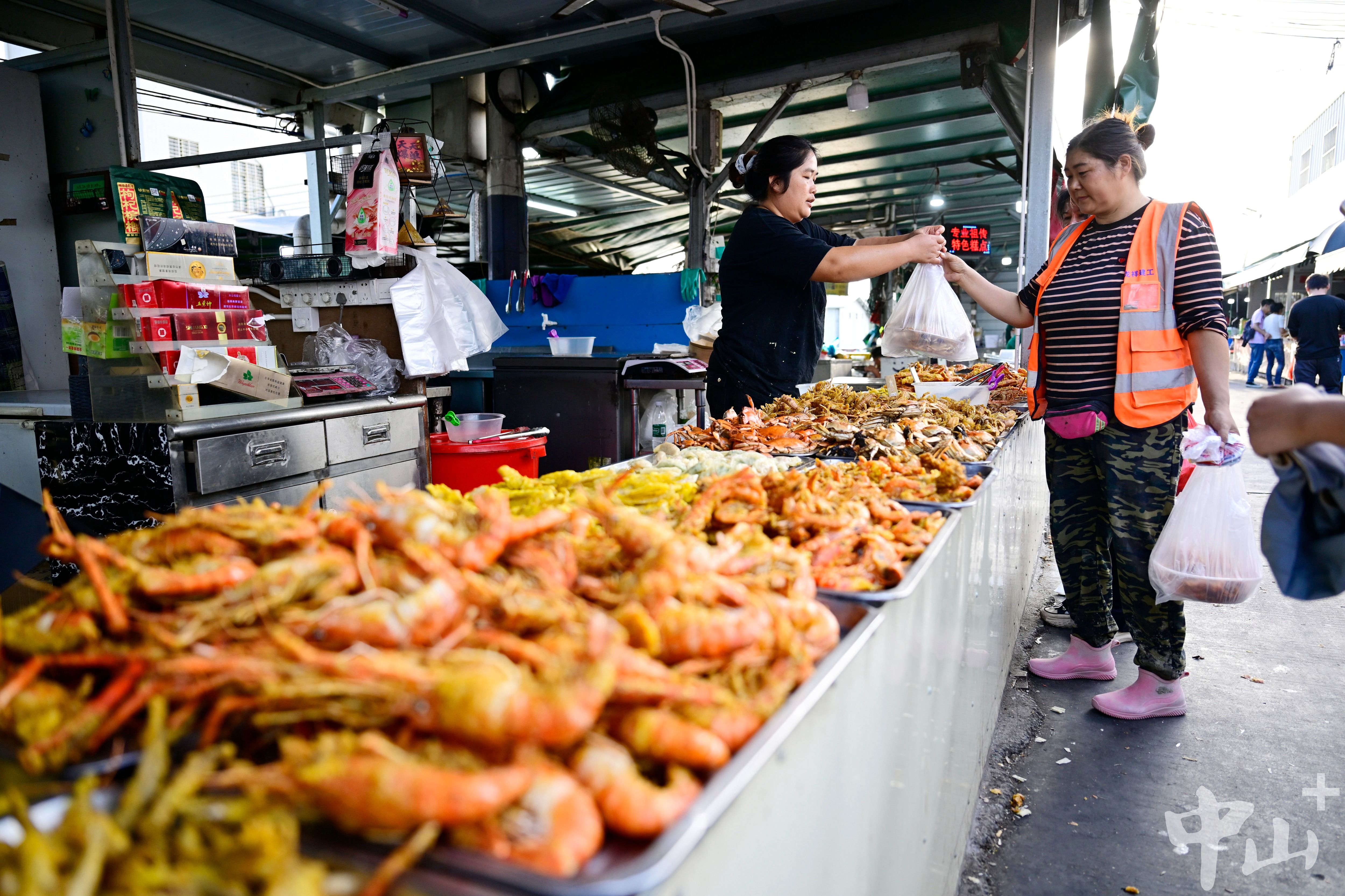 裹著薄脆面衣、泛著誘人油光的羅氏沼蝦,堆成小山的肥碩螃蟹,焦黃酥透、香氣撲鼻的小黃魚……集市中段的小吃攤前,身著黑色短袖的羅姨正手腳麻利地炸著特色美食。“以前在路邊擺攤,風(fēng)吹日曬是常事,遇上雨天更狼狽。現(xiàn)在有了固定攤位和遮陽棚,環(huán)境干凈整潔,路面也寬闊通暢,做生意舒心多了!”羅姨笑著說道。如今集市客流日益興旺,不僅吸引著周邊城鎮(zhèn)的居民,更有不少港澳游客慕名而來?!爸苣┖凸?jié)假日最忙,有時(shí)候要忙到晚上十點(diǎn),雖然累,但看著生意紅火,心里特別踏實(shí)?!?/p>