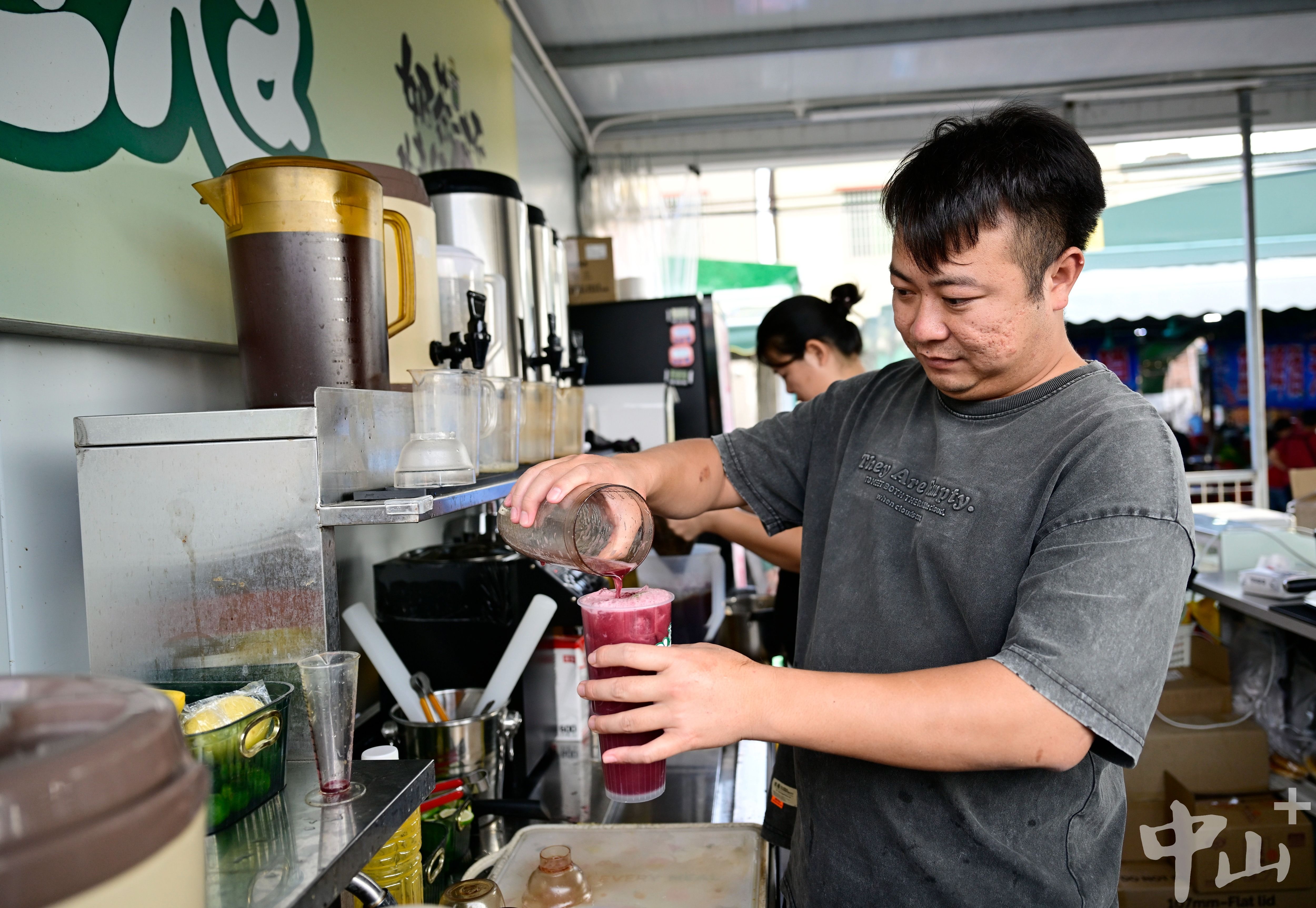 不遠(yuǎn)處的飲品店前,老板黃嘉俊夫婦正忙著制作奶茶、果茶。妻子吳翠賢以前在工廠做文員,每月收入3000多元。夫婦倆眼見集市發(fā)展得越來越好,便開起了這家飲品店。“淡季日均營收也有幾百元,旺季一天就能賣幾百杯,收入比以前翻了好幾倍。關(guān)鍵是在家門口就能賺錢,還能照顧家庭,比在工廠打工舒心多了?!眳谴滟t笑著說,現(xiàn)在節(jié)假日不少商家忙不過來還會(huì)請(qǐng)兼職,大家各司其職、互幫互助,眼看著日子越過越有奔頭。