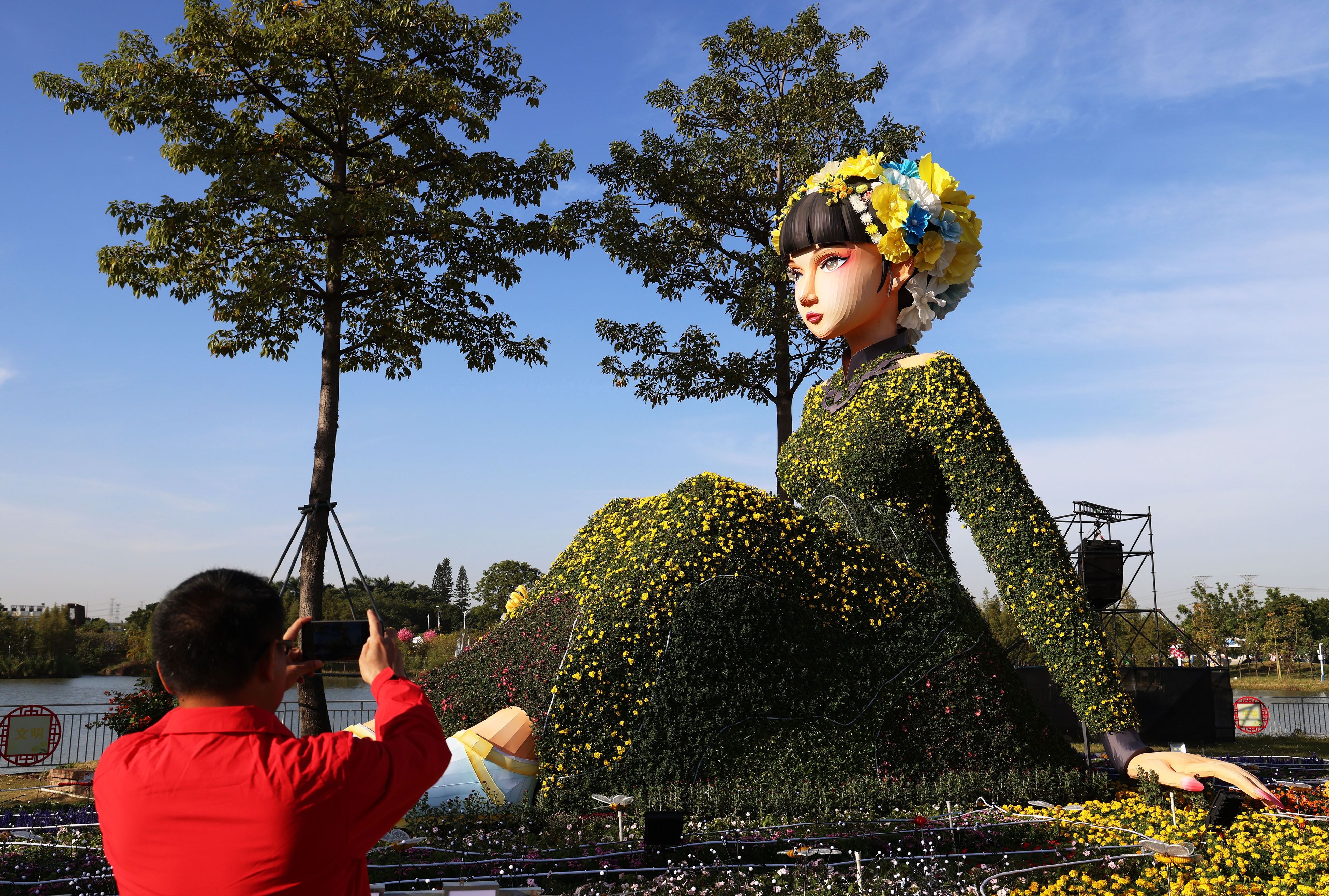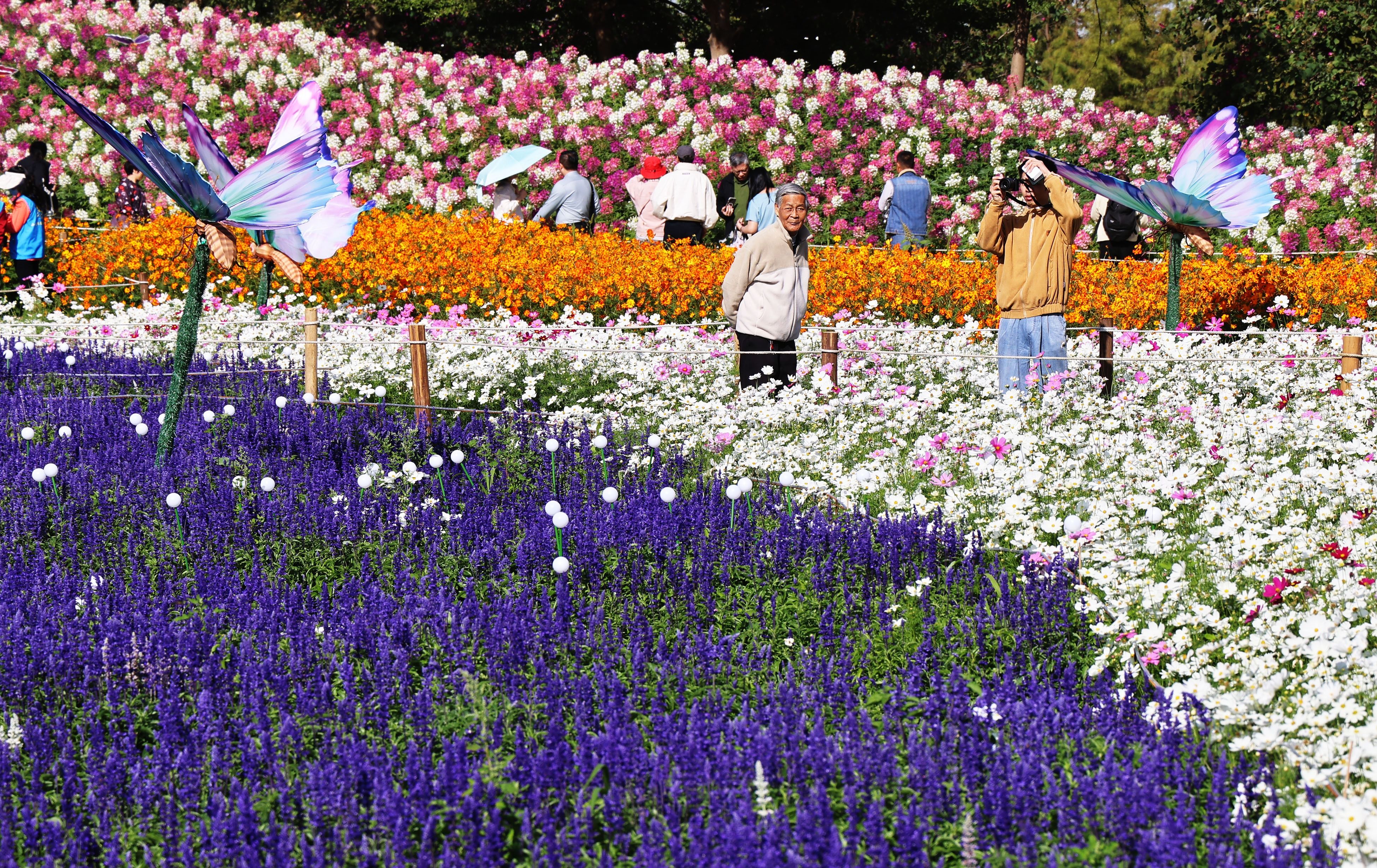 步入園區(qū),步行不到5分鐘便可抵達(dá)面積約2萬(wàn)平方米的花海區(qū)。此處以“蝴蝶女神”雕塑為核心,各色鮮花層層疊疊,迎風(fēng)怒放,構(gòu)成游客拍照留影的絕佳背景。繼續(xù)前行到臨湖展示區(qū)內(nèi),長(zhǎng)約25米、高約7米的“菊花女神”優(yōu)雅地曲膝倚坐于碧波之畔,姿態(tài)靈動(dòng),已成為園區(qū)的標(biāo)志性文化景觀之一。