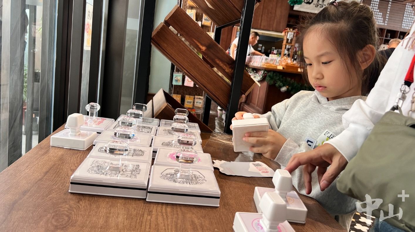 小朋友在四喜咖啡店里體驗(yàn)具有步行街和中山元素的蓋章文化打卡。記者 江慎諾 攝