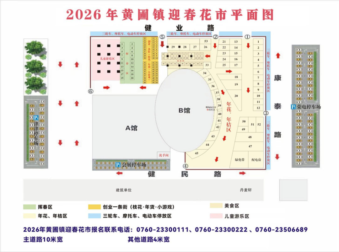 2026年三鄉(xiāng)平東迎春花市設有年桔花卉、工藝品、成衣百貨等檔位,分為年桔花卉檔位58個(包括年桔、菊花、蝴蝶蘭、干花等商品)、工藝品檔位6個(包括揮春、中國結(jié)、年畫、燈籠等傳統(tǒng)應節(jié)商品)、成衣百貨23個、年貨19個、水果18個。